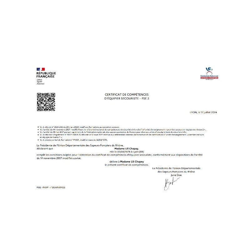 Lot de 100 certificats de compétence PSE2 numériques (droits d'impression diplômes).
